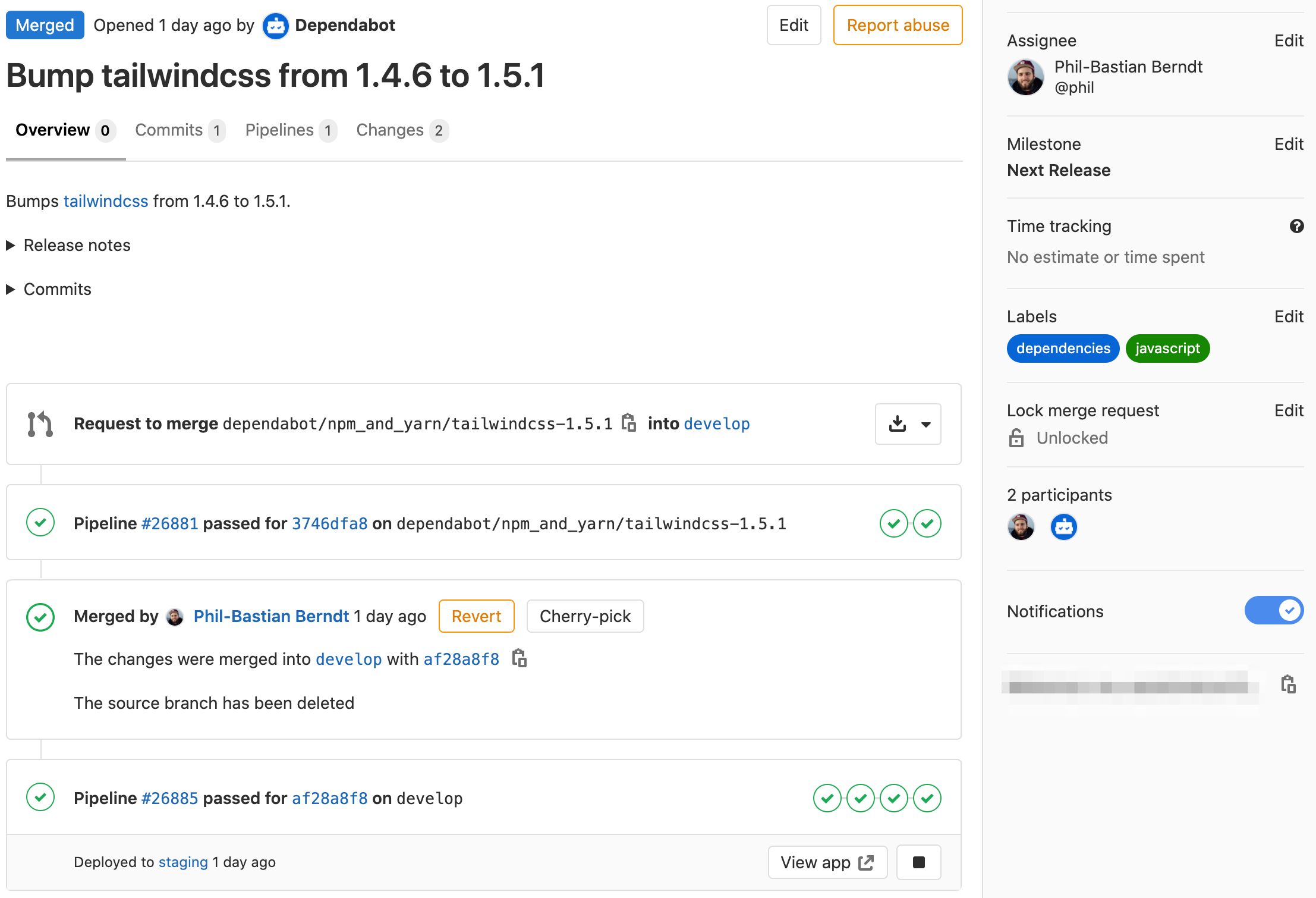 PROJECT_PATH: the path to the GitLab project (e.g.mygroup/myproject)GITLAB_ASSIGNEE_ID: the ID of the user to whom the created merge requests are assignedPACKAGE_MANAGER_SET: the package manager used in the project