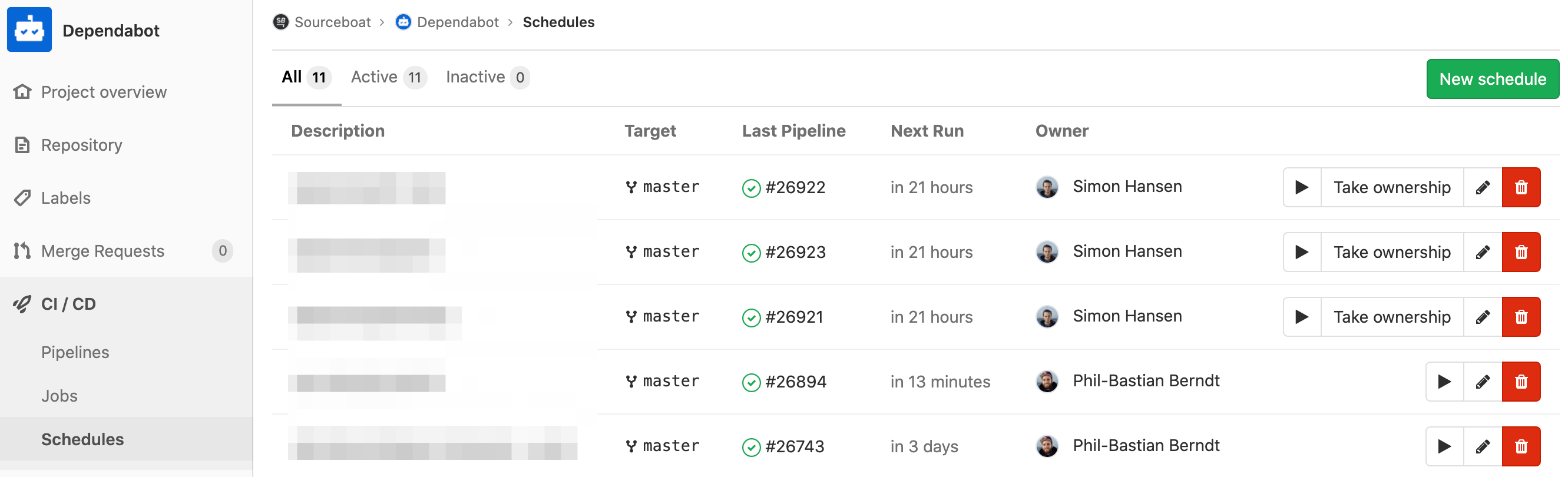 The pipeline schedules in the Dependabot project are our overview of all projects. A scheduled pipeline is created for each project, which executes the Dependabot update script with a job for the desired language. The interval can be set as you wish.